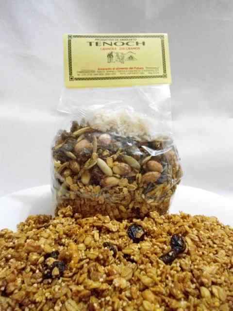 contiene nutritivos cereales, cacahuate, fibra, pasa, pepita, avena y cereal de amaranto.